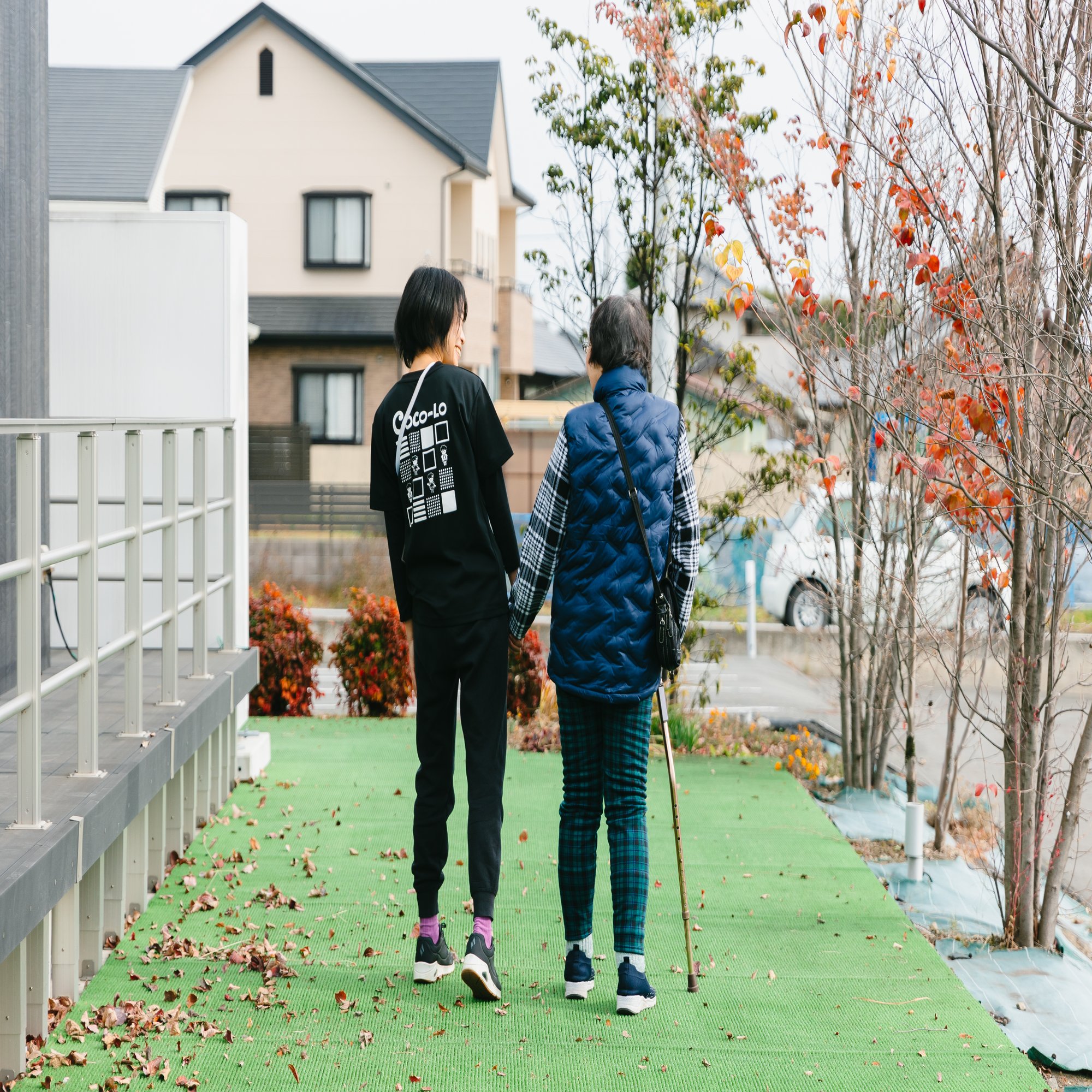 庭をお喋りしながら散歩するスタッフとお客様