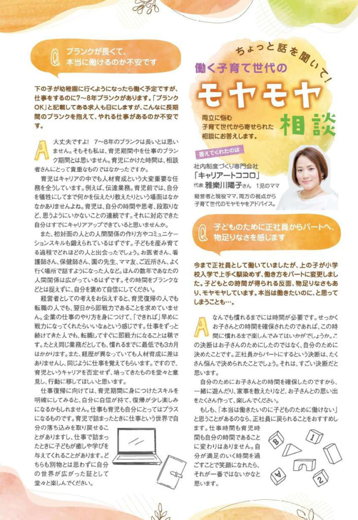 「まま・ここっと 群馬版・鳥取版」の「働く子育て世代のモヤモヤ相談」にて、代表 雅樂川陽子が子育て世代から寄せられた相談にお答えしています。